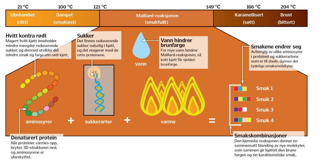 Den brune fargen på stekt kjøtt, ristet brød og ristede kaffebønner stammer fra en kjemisk prosess kalt Maillard-reaksjonen. Når maten blir oppvarmet, reagerer aminosyrene (byggeklossene i proteinet) med sukkerarter og danner hundrevis av smakskombinasjoner. Avhengig av type og mengde av de ulike aminosyrene i maten vil ulike smakskombinasjoner oppstå, noe du kan se i figuren.