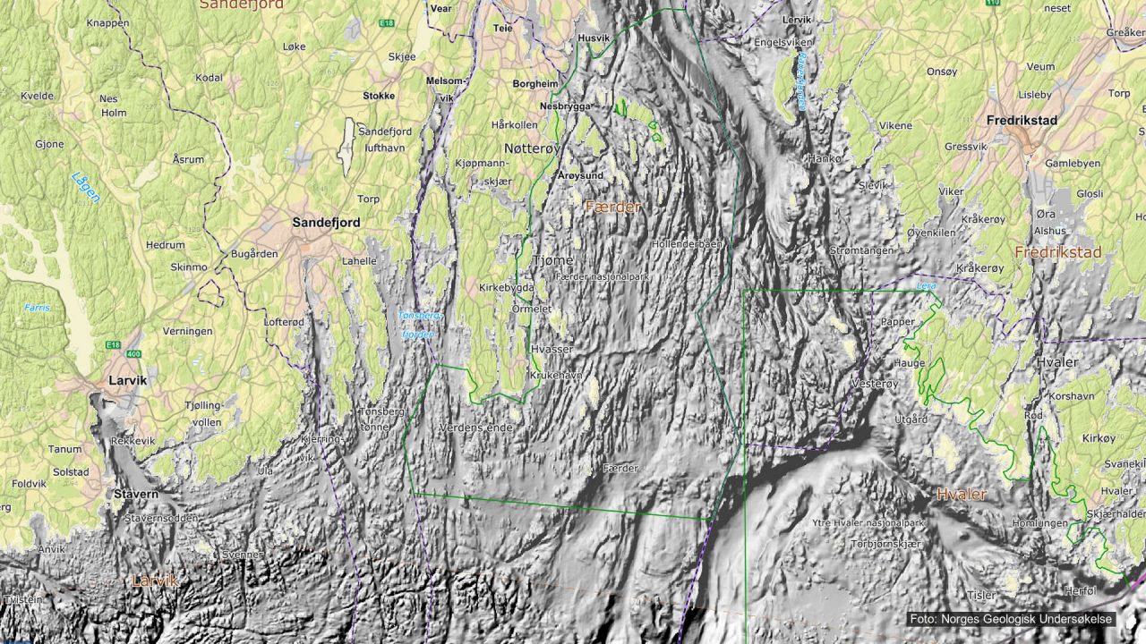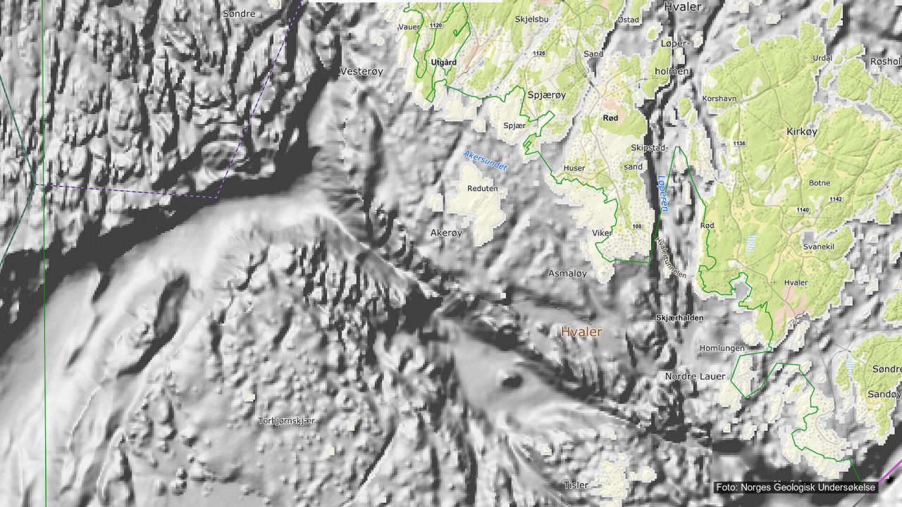 Under vann i Oslofjorden finnes dype daler og høye topper, nesten som på land. Sjøområdet er grått i dette kartet. Her møtes ferskvann fra elver og saltvann fra havet, og vannet legger seg i lag. Små endringer i vær, temperatur eller saltinnhold kan påvirke livet i fjorden.