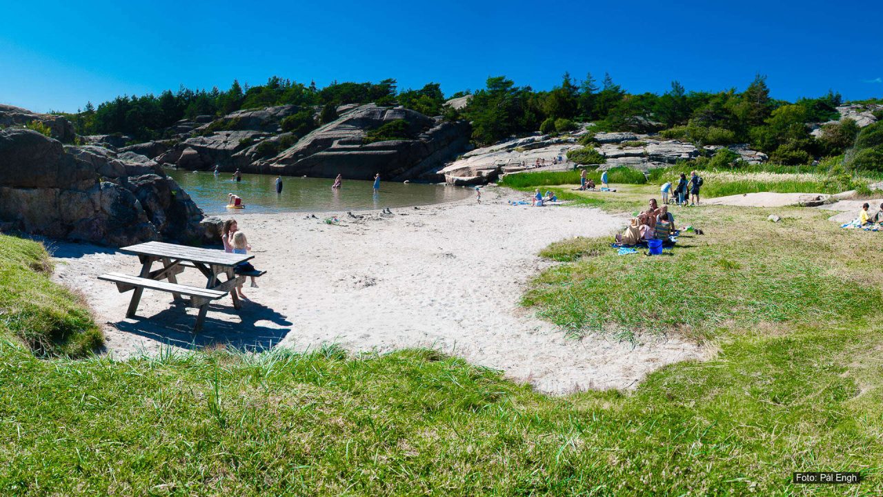 Mange mennesker bader og soler seg på sandstrand ved fjorden på en solrik sommerdag.